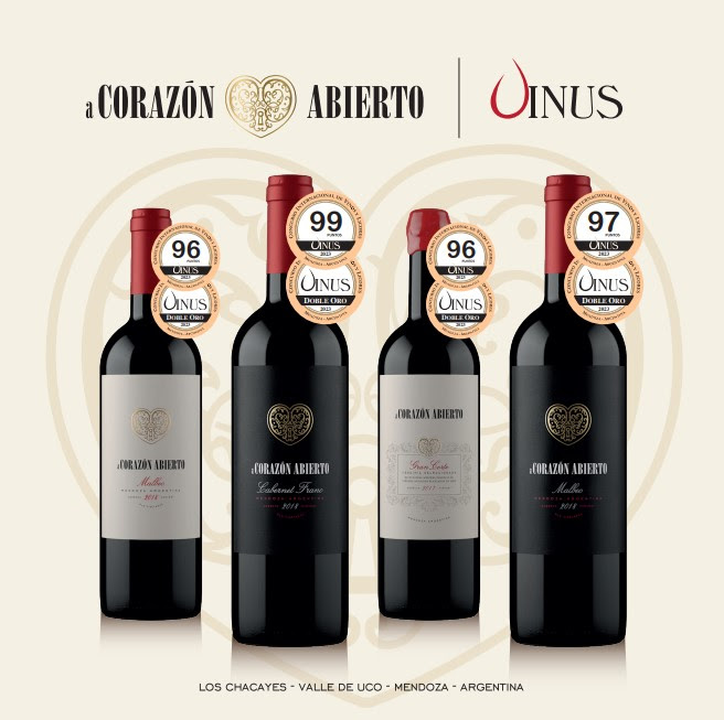 El jurado de Vinus 2023 otorgó Doble Medalla de Oro a cada vino de a Corazón Abierto, el proyecto mendocino que lidera el enólogo y asesor vitivinícola Leandro Azin. Los ejemplares que recibieron este año el máximo galardón que se otorga en ese prestigioso concurso internacional de vinos y licores, a través de una cata a ciegas, están elaborados con uvas seleccionadas de la IG Los Chacayes y representan cabalmente el terroir del que provienen. Se trata de a Corazón Abierto Etiqueta Negra Malbec 2018 (97 puntos), a Corazón Abierto Etiqueta Blanca Malbec 2018 (96 puntos), a Corazón Abierto Etiqueta Negra Cabernet Franc 2018 (99 puntos) y a Corazón Abierto Gran Corte 2017 (96 puntos).